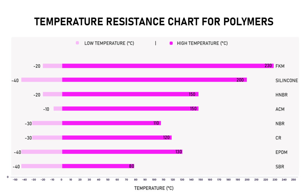 Rubber Name Low Temperature (°C) High Temperature (°C) SBR -40 80 EPDM -40 130 CR -30 120 NBR -30 110 ACM -10 150 HNBR -20 150 SILICONE -40 200 FKM -20 230